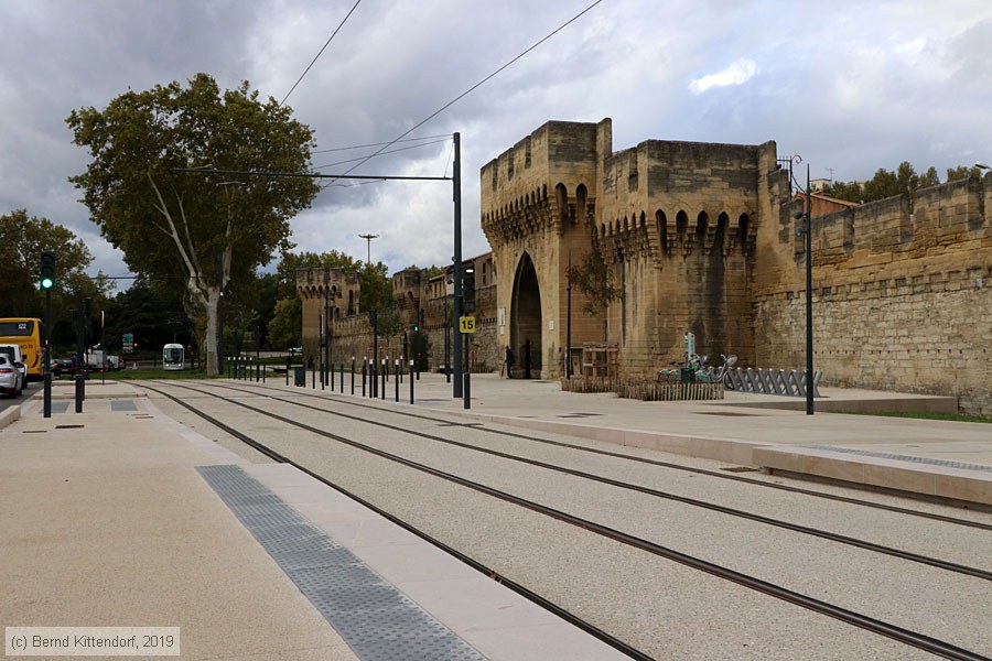| Straßenbahn Avignon - Anlagen Gleise bei der Endstelle Saint-Roch - Université des Métiers, aufgenommen am 04. November 2019. In Blickrichtung befinden sich die für das Umsetzen genutzten Gleise. Links unten am Bildrand befindet sich der Bahnsteig für den Einstieg zur Linie T1 nach Saint-Chamand. Rechts im Bild ist die Stadtmauer mit dem Tor Porte Saint-Roch zu sehen, einem von sieben Haupttoren. Photo: Bernd Kittendorf (info@bernd-kittendorf.de) Homepage: www.bernd-kittendorf.de |