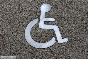 Rollstuhl-Symbol, eingelassen im Bahnsteig der Haltestelle Trillade - Médiathèque für die Linie T1 nach Saint-Roch und aufgenommen am 04. November 2019. Für Rollstuhlfahrer ist es angenehm, so schon vor der Ankunft des Zuges Informationen darüber zu haben, wo der Einstieg für den Rollstuhl zum Stehen kommen wird. Möglich ist das bei einem typengleichen Wagenpark.
