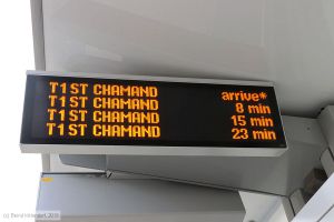 Anzeige des Dynamischen Fahrgastinformationssystems an der Haltestelle Saint-Roch - Université des Métiers, aufgenommen am 04. November 2019. Mittels LED-Technik werden vierzeilig die folgenden Abfahrten der Linie T1 nach Saint-Chamand - Plaine des Sports angekündigt. Ein Zug kommt eben am Bahnsteig an (arrive), die nächsten folgen jeweils mit sieben bis acht Minuten Abstand.