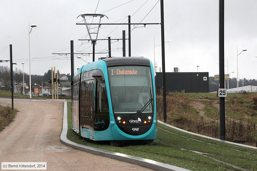 | Straßenbahn Besançon - 809 Triebwagen 809 auf Linie 1 bei der Ankunft an der Endstelle Chalezeule, aufgenommen am 16. Dezember 2014. Die Strecke wird kurz vor dem Bahnsteig der Endstelle eingleisig. Photo: Bernd Kittendorf (info@bernd-kittendorf.de) Homepage: www.bernd-kittendorf.de |