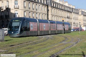 Triebwagen 2546 auf Linie C nach Les Aubiers bei der Abfahrt von der Haltestelle Porte de Bourgogne, aufgenommen am 21. Oktober 2016. Bei diesem Fahrzeug wird die Sicht aus dem Fahrgastraum und in den Fahrgastraum durch auf die Fenster geklebte Werbung erschwert. Sogar Glasflächen der Türen sind beklebt, was für Fahrgäste mit schlechtem Sehvermögen hinderlich ist. Fabulous im Sinne von wundervoll ist solche Fensterflächenwerbung aus meiner Sicht bestimmt nicht.