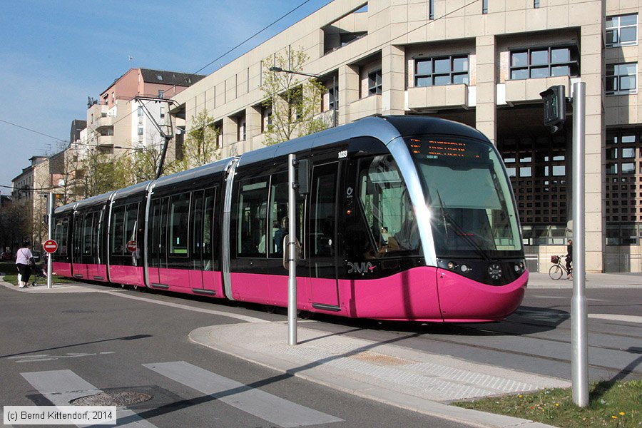 | Straßenbahn Dijon - 1033 Triebwagen 1033 auf Linie T1 nach Quetigny Centre aus Richtung der Haltestelle République kommend bei der Haltestelle Auditorium, aufgenommen am 01. April 2014. Photo: Bernd Kittendorf (info@bernd-kittendorf.de) Homepage: www.bernd-kittendorf.de |