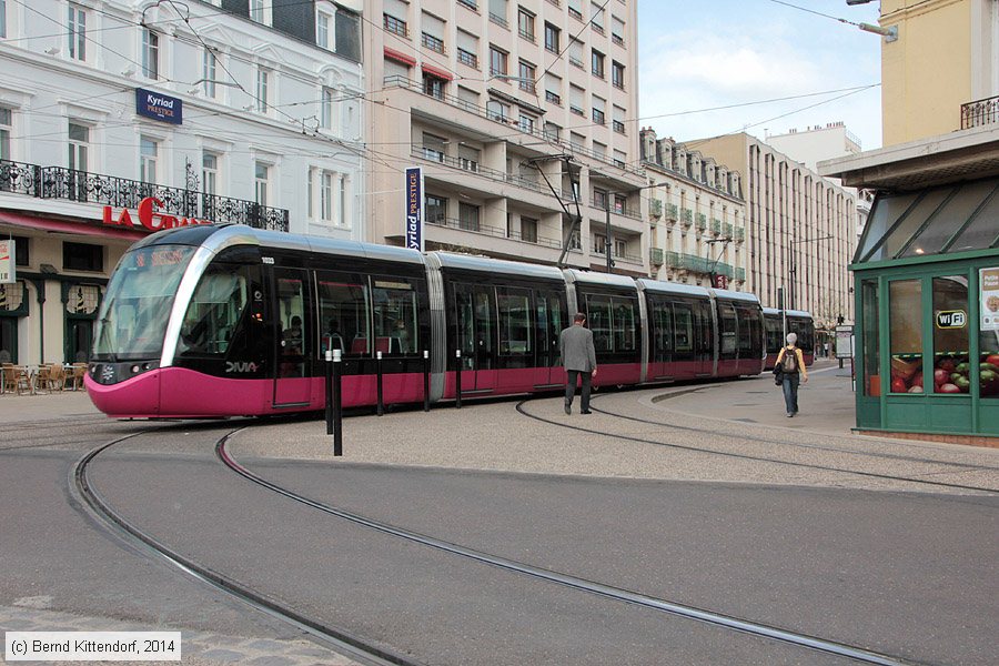 | Straßenbahn Dijon - 1033 Triebwagen 1033 auf Linie T1 nach Quetigny Centre an der Haltestelle Foch Gare, aufgenommen am 01. April 2014. Photo: Bernd Kittendorf (info@bernd-kittendorf.de) Homepage: www.bernd-kittendorf.de |