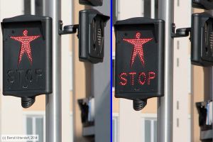 Lichtsignal an einem Fußgängerüberweg an der Strecke der Linie T1 zwischen den Haltestellen République und Auditorium, aufgenommen am 01. April 2014.