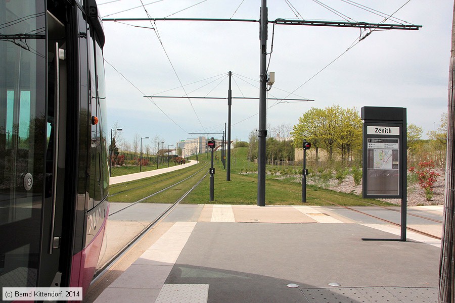 | Straßenbahn Dijon - Anlagen Haltestelle Zénith, aufgenommen am 02. April 2014. In Blickrichtung führt die Strecke zur Haltestelle Toison d'Or. Am Bahnsteig steht Triebwagen 1011 auf Linie T2 nach Chenôve Centre (links im Bild). Die Haltestelle Zénith verfügt über ein drittes Gleis. Die zugehörige Weiche wird von den beiden Weichensignalen am Bahnsteigende gesichert. Photo: Bernd Kittendorf (info@bernd-kittendorf.de) Homepage: www.bernd-kittendorf.de |