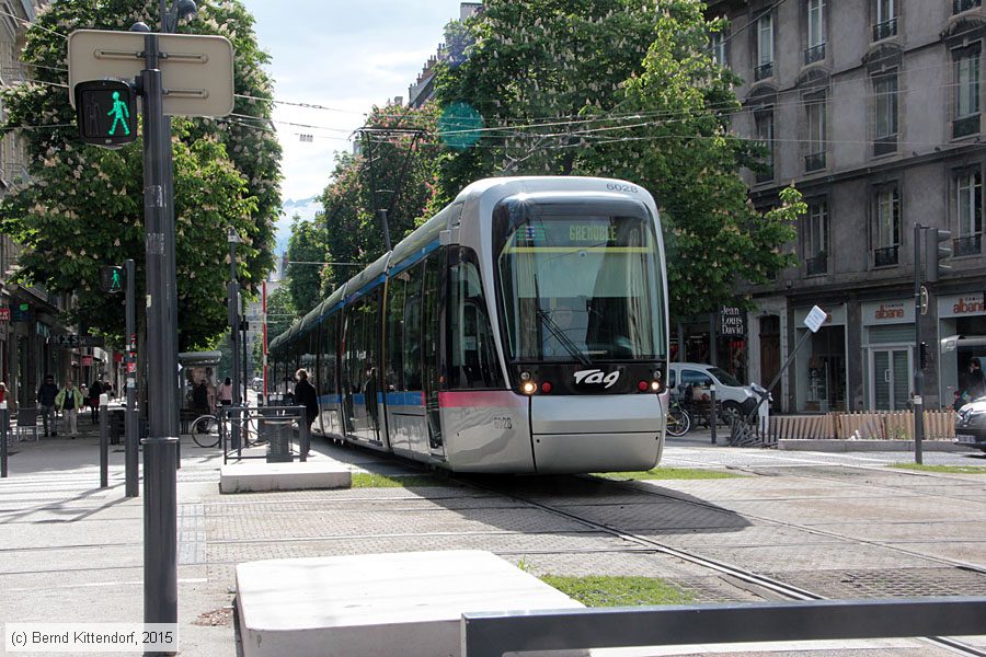 | Straßenbahn Grenoble - 6028 Triebwagen 6028 auf Linie B nach Grenoble - Presqu'île bei der Abfahrt von der Haltestelle Alsace-Lorraine, aufgenommen am 27. April 2015 an der Kreuzung mit der Strecke der Linie E. Photo: Bernd Kittendorf (info@bernd-kittendorf.de) Homepage: www.bernd-kittendorf.de |