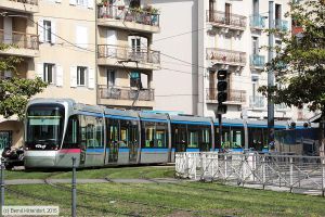 Triebwagen 6033 auf Linie B nach Presqu'île bei der Abfahrt von der Haltestelle Alsace-Lorraine, aufgenommen am 26. April 2015. Unten am Bildrand sind die Gleise der Linie E zu sehen. Die Schranke links im Bild sichert den Streckenabschnitt gegen die Durchfahrt unberechtigter Kraftfahrzeuge ab und wurde gerade für die abfahrende Straßenbahn geöffnet.