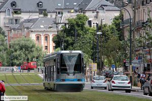 Triebwagen 2034 (rechts im Bild) wartet an der Haltestelle Alsace-Lorraine der Linie E auf die Weiterfahrt, während Triebwagen 6013 gerade die Kreuzung befährt. Die Aufnahme ist am 28. Juni 2014 entstanden.