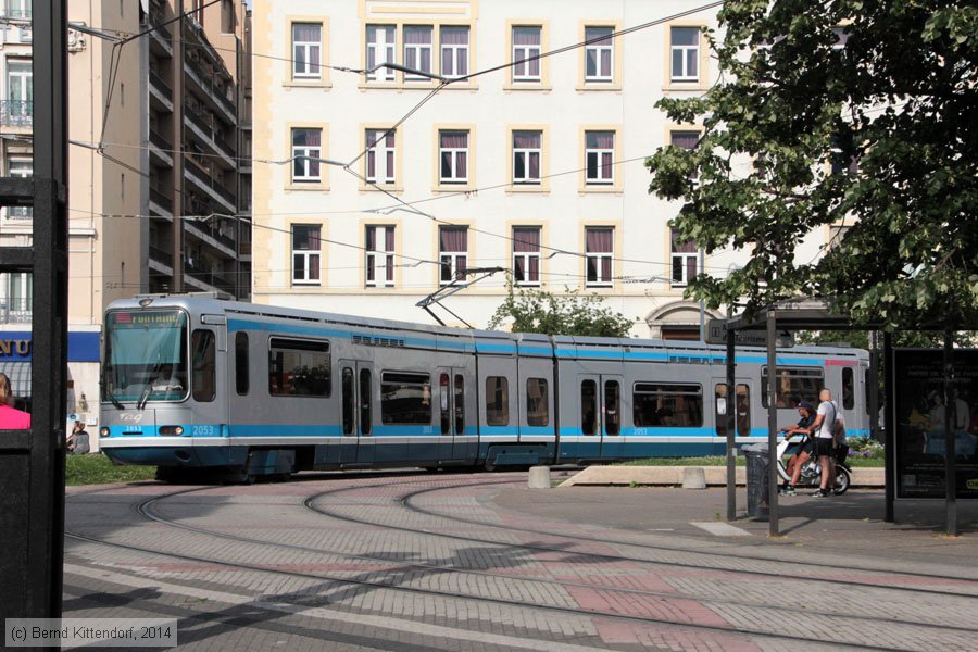 | Straßenbahn Grenoble - 2053 Triebwagen 2053 auf Linie A nach Fontaine - La Poya bei der Ankunft an der Haltestelle Gares, aufgenommen am 28. Juni 2014. Photo: Bernd Kittendorf (info@bernd-kittendorf.de) Homepage: www.bernd-kittendorf.de |