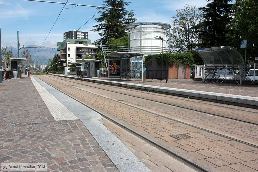 | Straßenbahn Grenoble - Anlagen Seitenbahnsteige der Haltestelle Échirolles - Denis Papin der Linie A, aufgenommen am 26. April 2014. Die Bahnsteige sind über flache Rampen am Ende zugänglich. Der Gleisbereich zwischen den beiden Bahnsteigen ist gepflastert. In Blickrichtung folgt die Haltestelle Auguste Delaune. Photo: Bernd Kittendorf (info@bernd-kittendorf.de) Homepage: www.bernd-kittendorf.de |