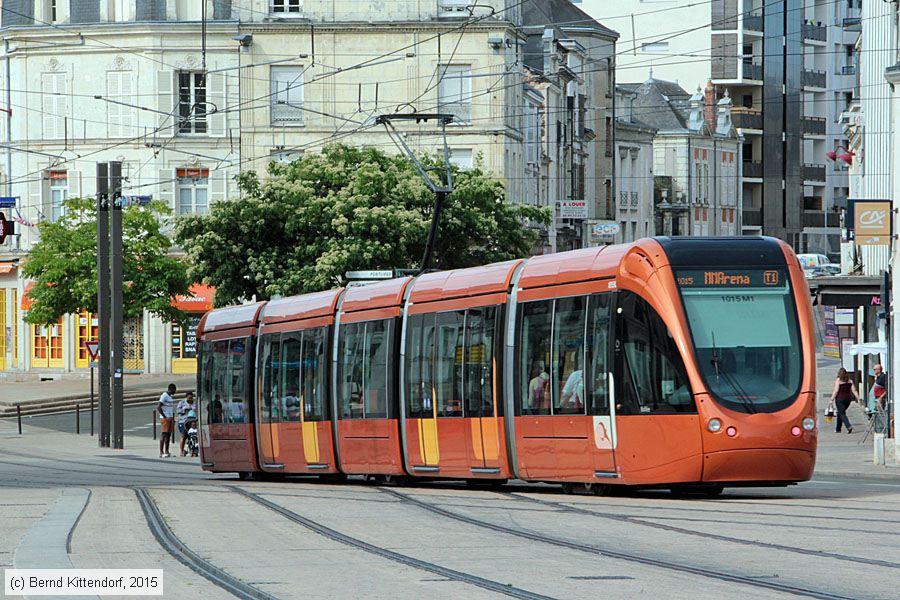 | Straßenbahn Le Mans - 1015 Triebwagen 1015 auf Linie T1 nach Antarès - MMArena bei der Ankunft an der Haltestelle Préfecture, aufgenommen am 22. Juli 2015. Die Gleise unten im Bild gehören zur Strecke der Linie T2 nach Bellevue. Photo: Bernd Kittendorf (info@bernd-kittendorf.de) Homepage: www.bernd-kittendorf.de |