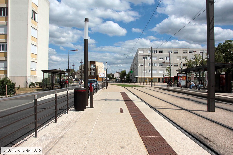 | Straßenbahn Le Mans - Anlagen Bahnsteige und Gleise der Endstelle Bellevue - Hauts de Coulaines der Linie T2, aufgenommen am 22. Juli 2015. Photo: Bernd Kittendorf (info@bernd-kittendorf.de) Homepage: www.bernd-kittendorf.de |