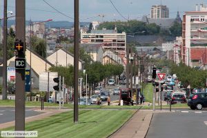 Strecke der Linie T1 von der Haltestelle Glonnières - Centre Sud in Richtung Zentrum, aufgenommen am 22. Juli 2015. An dieser Haltestelle gibt es ein Einkaufszentrum. Die nächste Station in Blickrichtung ist Goya.
