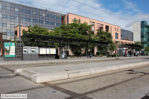 Haltestelle Debourg, aufgenommen am 27. April 2014. Im Hintergrund steht Triebwagen 0810 auf dem Kehrgleis.