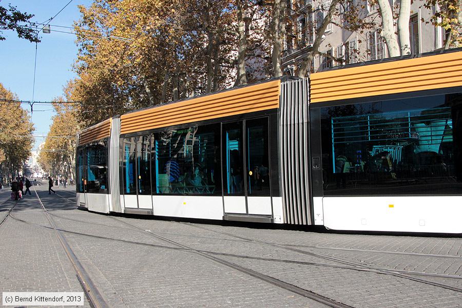 | Straßenbahn Marseille - 006 Triebwagen 006 auf Linie T2 nach Arenc - Le Silo beim Abbiegen an der Ecke La Canebière / Cours Belsunce, aufgenommen am 04. Dezember 2013. Photo: Bernd Kittendorf (info@bernd-kittendorf.de) Homepage: www.bernd-kittendorf.de |