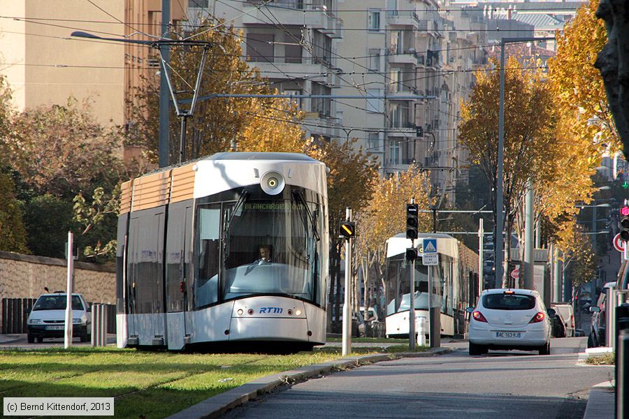 | Straßenbahn Marseille - 008 Triebwagen 008 (links im Bild) auf Linie T2 bei der Ankunft an der Endstelle Blancarde - Foch, aufgenommen am 05. Dezember 2013. Weiter rechts ist Triebwagen 006 auf Linie T2 nach Arenc - Le Silo zu sehen, der kurz zuvor abgefahren ist. Photo: Bernd Kittendorf (info@bernd-kittendorf.de) Homepage: www.bernd-kittendorf.de |