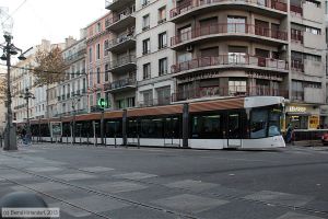 Triebwagen 011 auf Linie T2 nach Blancarde - Foch an der Haltestelle Belsunce - Alcazar, aufgenommen am 05. Dezember 2013.