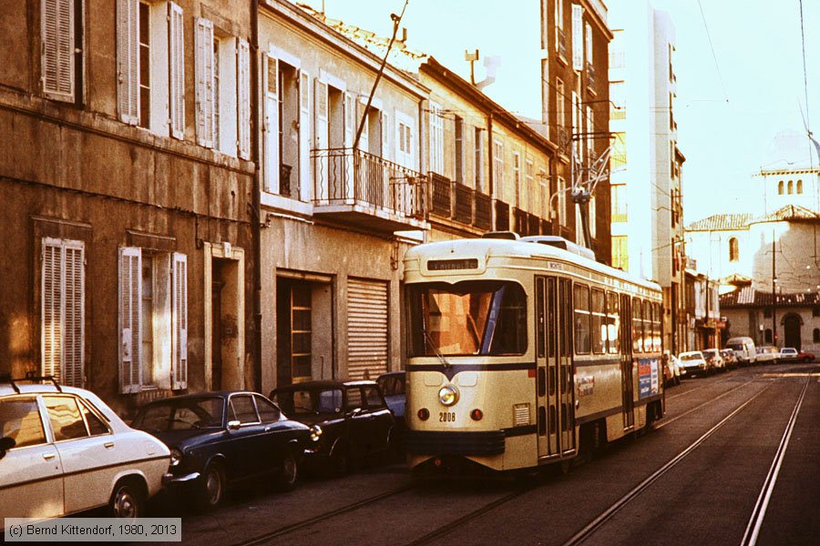 | Straßenbahn Marseille - 2008 Triebwagen 2008 auf Linie 68 nahe der Endstelle Saint Pierre, aufgenommen am 07. Januar 1980. Diese PCC-Triebwagen sind bei einer Spurweite von 1.430 mm nur 2.020 mm breit (nach Umbau 2.060 mm). Die Gleisanlagen waren wegen des geringen Gleisabstands für breitere Fahrzeuge nicht nutzbar. Dieses Fahrzeug war mit der Betriebsnummer TA 11 noch bis zum 09. Januar 2004 im Bestand. Es ist zusammen mit dem TA 15 museal erhalten geblieben. Photo + Scan: Bernd Kittendorf (info@bernd-kittendorf.de) Homepage: www.bernd-kittendorf.de |