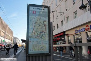 Schild der Haltestelle Jean Médecin der Linie T1, aufgenommen am 07. Dezember 2013. Auf dem abgebildeten Linienplan ist die noch einzige Straßenbahn-Linie rot eingezeichnet.