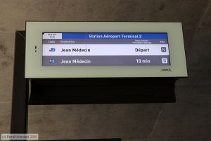 Anzeige des Dynamischen Fahrgastinformationssystems von Lumiplan an der Haltestelle Aéroport Terminal 2, aufgenommen am 06. November 2019. Von hier fährt die Linie 2 nach Jean Médecin - Centre Ville. Die beiden Gleise der Stumpfendstelle tragen die Bezeichnungen Voie N und Voie S.
