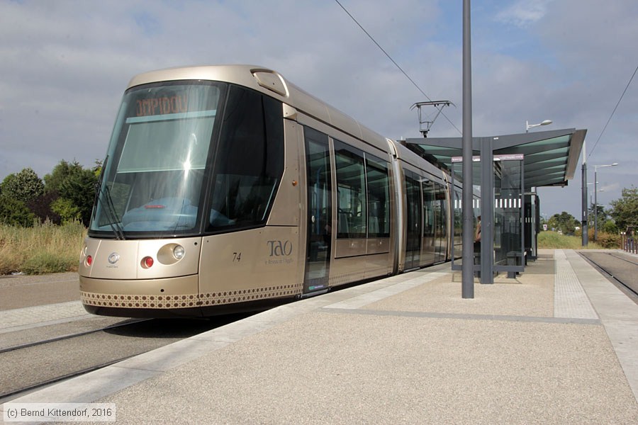 | Straßenbahn Orléans - 74 Triebwagen 74 auf Linie B nach Georges Pompidou an der Haltestelle Clos du Hameau auf Gleis 1, aufgenommen am 21. Juli 2016. Die östliche Endstelle der Linie B hat einen Mittelbahnsteig, dort als quai central bezeichnet. Der Mittelbahnsteig ist an beiden Enden über flache Rampen zugänglich. Das südliche Gleis am Mittelbahnsteig (rechts am Bildrand) wird als Voie 2 bezeichnet. Photo: Bernd Kittendorf (info@bernd-kittendorf.de) Homepage: www.bernd-kittendorf.de |