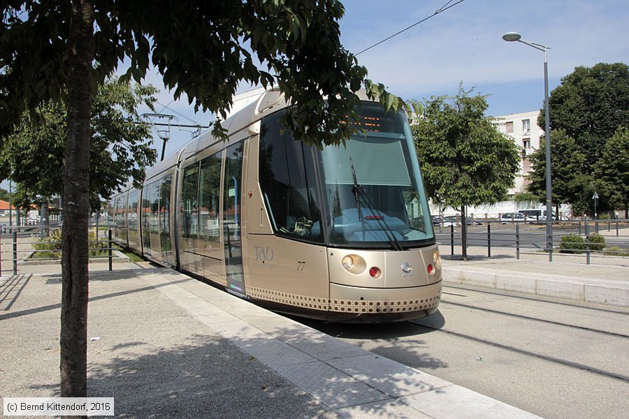| Straßenbahn Orléans - 77 Triebwagen 77 auf Linie B nach Clos du Hameau bei der Ankunft an der Haltestelle Rol Tanguy, aufgenommen am 22. Juli 2016. Diese Haltestelle verfügt über zwei Seitenbahnsteige. Photo: Bernd Kittendorf (info@bernd-kittendorf.de) Homepage: www.bernd-kittendorf.de |