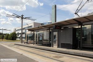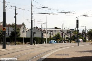 Gleis 1 bei der End-Haltestelle Georges Pompidou der Linie B, aufgenommen am 22. Juli 2016. Dieses Gleis führt noch einige Meter nach dem Mittelbahnsteig weiter und ermöglicht so das Abstellen von Fahrzeugen ohne weitere Störungen für den Betriebsablauf. Links am Bildrand ist die Bushaltestelle der Linien 2 und 4 zu sehen.