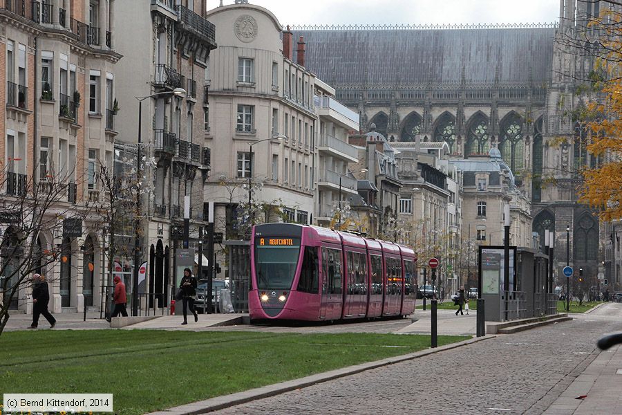 | Straßenbahn Reims - 101 Triebwagen 101 auf Linie A nach Neufchâtel an der Haltestelle Langlet, aufgenommen am 06. November 2014 mit der Kathedrale rechts im Hintergrund. Hier erfolgt die Stromversorgung für die Straßenbahn mittels APS (Alimentation par le sol) durch eine in den Fahrweg eingelassene Stromschiene. Photo: Bernd Kittendorf (info@bernd-kittendorf.de) Homepage: www.bernd-kittendorf.de |