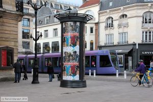 Triebwagen 104 auf Linie A nach Hôpital Debré an der Haltestelle Opéra auf dem Place Myron-Herrick, aufgenommen am 06. November 2014.
