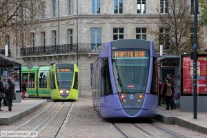 Triebwagen 104 auf Linie A nach Hôpital Debré an der Haltestelle Gare Centre, aufgenommen am 06. November 2014. Links im Hintergrund erreicht Triebwagen 107 auf Linie A nach Neufchâtel die Haltestelle.