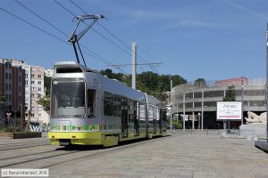 Triebwagen 924 auf Linie T3 nach Solaure bei der Ankunft an der Haltestelle Campus Tréfilerie, aufgenommen am 03. August 2016.