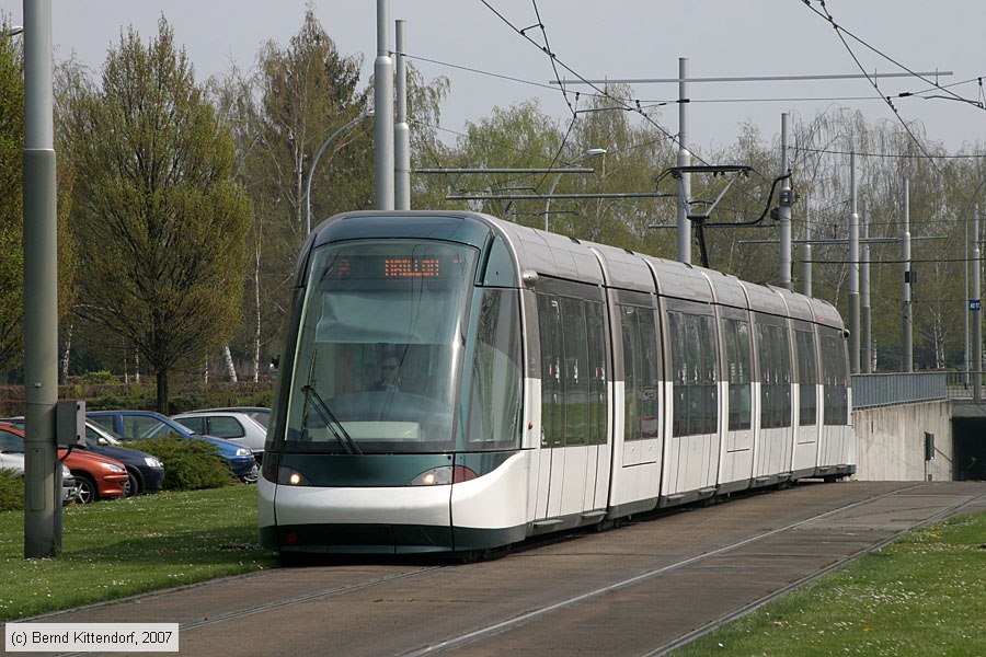 | Straßenbahn Strasbourg - 2022 Triebwagen 2022 auf Linie A nach Hautepierre Maillon bei der Ankunft an der Haltestelle Rotonde, aufgenommen am 07. April 2007. Photo: Bernd Kittendorf (info@bernd-kittendorf.de) Homepage: www.bernd-kittendorf.de |