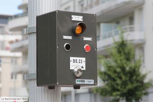 Schlüsselschalter BS.22 vom Hersteller Vossloh Cogifer an der Haltestelle Poteries der Linie D, aufgenommen am 01. Juli 2016. Hier kann der Fahrer bei Bedarf die Ausfahrt vers Gioberti 22 --> 13 anfordern oder auch wieder zurücknehmen.