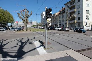 Gleise bei der Haltestelle Aristide Briand der Linie D, aufgenommen am 30. April 2017. In Blickrichtung fahren die Züge nach Port du Rhin und Kehl Bahnhof.
