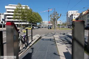 Strecke der Linie D von der Haltestelle Aristide Briand in Richtung der zunächst nur während des Eröffnungswochenendes genutzten Haltestelle Citadelle, aufgenommen am 30. April 2017 mit der anschließenden neuen Brücke im Hintergrund.
