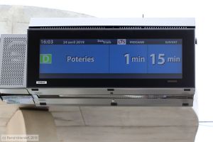 Anzeige des Dynamischen Fahrgastinformationssystems an der Haltestelle Kehl Rathaus der Linie D, aufgenommen am 24. April 2019. Die nächsten Abfahrten in Richtung Poteries sind in einer und 15 Minuten vorgesehen. Das Gerät stammt von Conrac.