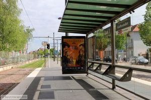 Bahnsteige der neuen Haltestelle an der Streckenverlängerung ab der bisherigen Endstelle Robertsau Boecklin der Linie E, aufgenommen am 25. April 2019. Diese Haltestelle soll den Namen Jardiniers bekommen, in Blickrichtung soll die Haltestelle Mélanie folgen. Gemäß den Planungsunterlagen erhalten alle drei neuen Stationen je zwei Seitenbahnsteige mit 45,50 Meter Länge und mindestens 3,50 Meter Breite. Interessantes Detail: die Werbeflächen werden schon genutzt.