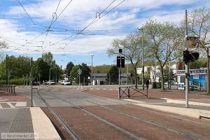 Gleise bei der Haltestelle Campus d'Illkirch, aufgenommen am 25. April 2019. Die Strecke der Linie A auf dem Weg nach Graffenstaden biegt nach rechts ab, nach links führen Gleise in die Umsetz- und Abstellanlage der Linie E.