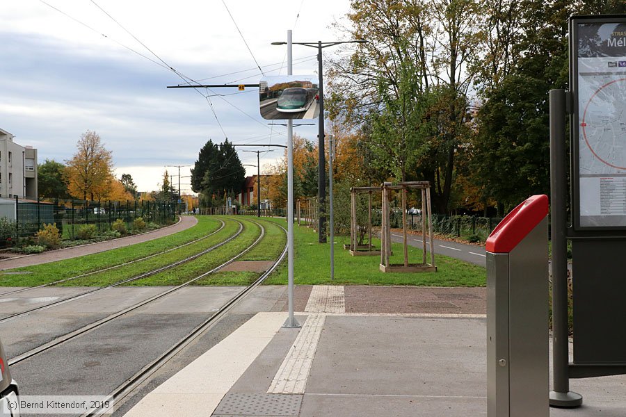 | Straßenbahn Strasbourg - Anlagen Strecke der Linie E in Richtung der Haltestelle Jardiniers bei der Haltestelle Mélanie, aufgenommen am 17. Oktober 2019. Rechts im Bild steht ein Fahrkarten-Entwerter. Am Bahnsteigende gewährt ein Spiegel dem Fahrpersonal den Blick auf die Situation am Bahnsteig. Die Strecke ist als Rasengleis ausgeführt. Photo: Bernd Kittendorf (info@bernd-kittendorf.de) Homepage: www.bernd-kittendorf.de |