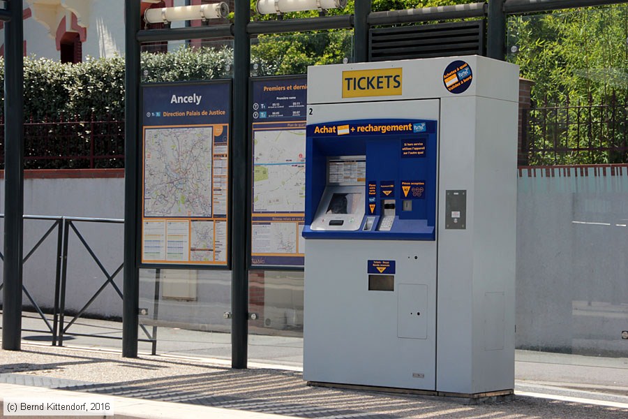| Straßenbahn Toulouse - Anlagen Fahrkartenautomat an der Haltestelle Ancely der Linien T1 und T2 am Bahnsteig für die Fahrtrichtung Palais-de-Justice, aufgenommen am 18. Juli 2016. Photo: Bernd Kittendorf (info@bernd-kittendorf.de) Homepage: www.bernd-kittendorf.de |