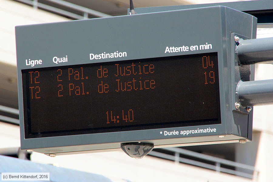 | Straßenbahn Toulouse - Anlagen Anzeige des Dynamischen Fahrgastinformationssystems in LED-Technik an der Haltestelle Aéroport der Linie T2, aufgenommen am 18. Juli 2016 gegen 14:40 Uhr. Die nächsten beiden Abfahrten der Linie T2 zum Palais-de-Justice sollen demnach in vier und 19 Minuten erfolgen. Photo: Bernd Kittendorf (info@bernd-kittendorf.de) Homepage: www.bernd-kittendorf.de |