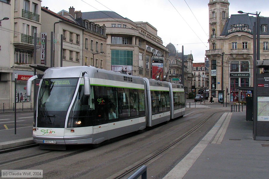 | Transport léger guidé de Nancy - 6 Wagen 6 auf Linie T1 auf dem Weg nach Vandœuvre CHU Brabois beim Bahnhof Nancy, aufgenommen am 26. September 2004. Es handelt sich um dreiteilige Gelenkwagen in Einrichtungsbauart. Photo: Claudia Wolf (info@claudia-blondie-wolf.de) Homepage: www.claudia-blondie-wolf.de |