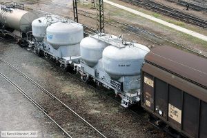 Wagen 48 55 9171 010-1p H-PULT (Typ Ucmms, Wagen für staubförmige Güter) in einem Güterzug beim Bahnhof Budapest Ferencváros, aufgenommen am 20. September 2008.
