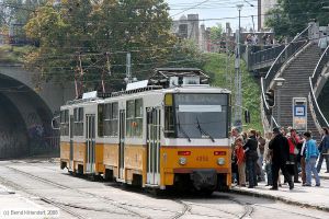 Triebwagen 4056 (vorn am Zug) mit Triebwagen 4001 (rechts im Bild) auf Linie 56 nach Hűvösvölgy bei der Abfahrt von der Haltestelle Széll Kálmán tér, aufgenommen am 31. August 2016. Von 1951 bis 2011 wurde diese Haltestelle Moszkva tér genannt.