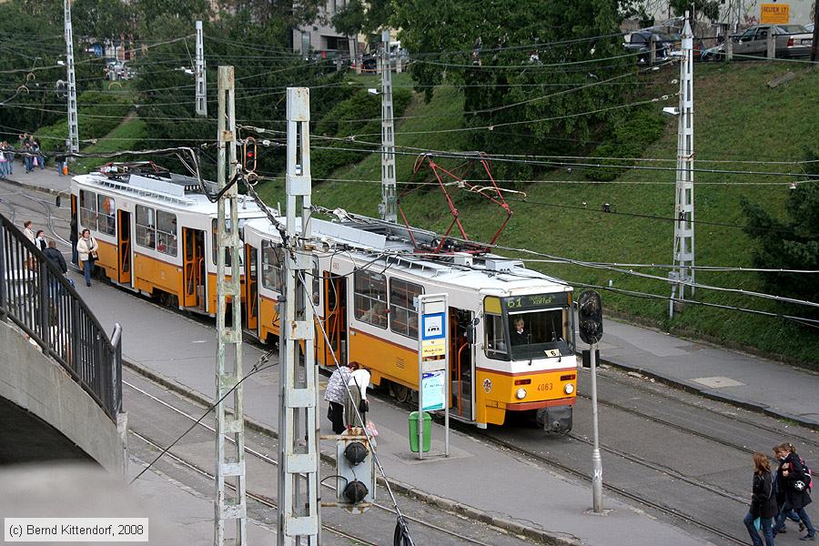 | Budapest - Straßenbahn - 4063 Triebwagen 4063 (vorn am Zug) mit Triebwagen 4062 (links im Bild) auf Linie 61 zum Móricz Zsigmond körtér an der Haltestelle Moszkva tér, aufgenommen am 19. September 2008. Photo: Bernd Kittendorf (info@bernd-kittendorf.de) Homepage: www.bernd-kittendorf.de |