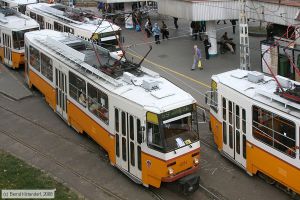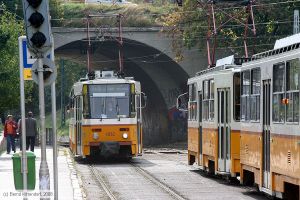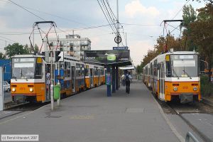 Triebwagen 4074 (links im Bild) und Triebwagen 4061 (rechts im Bild) auf Linie 1A an der Haltestelle Salgótarjáni út, aufgenommen am 09. August 2007. Hier besteht Umsteigemöglichkeit zur Linie 37.