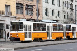 Triebwagen 4313 (vorn am Zug) mit Triebwagen 4070 (links im Bild) vor einem Einsatz auf Linie 28A nach Új köztemető - Kozma utca an der Haltestelle Blaha Lujza tér, aufgenommen am 26. Februar 2017. Új köztemető bedeutet Neuer allgemeiner Friedhof.