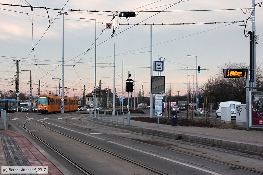 | Budapest - Straßenbahn - Anlagen Haltestelle Élessarok, aufgenommen am 01. März 2017. An diesen Bahnsteigen halten die Linien 3, 28, 28A, 62 und 62A und Busse. Die Seitenbahnsteige sind für den Einsatz der Niederflurtriebwagen erhöht worden. Photo: Bernd Kittendorf (info@bernd-kittendorf.de) Homepage: www.bernd-kittendorf.de |