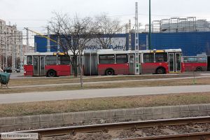Gelenk-Oberleitungsbus 308 auf Linie 82 an der Haltestelle Örs vezér tere, aufgenommen am 28. Februar 2017.