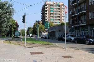 Triebwagen 7108 auf Linie 31 bis Bicocca bei der Abfahrt von der Haltestelle Cinisello Balsamo - Monte Ortigara, aufgenommen am 26. August 2019 in der Via Risorgimento. Gemäß Verkehrszeichen gibt es hier eine Ausnahme vom Halteverbot (rechts im Bild).